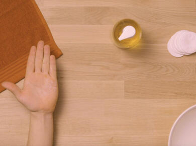 • Pasul 2: Aplică ulei În ziua următoare, dacă pe piele a mai rămas super glue, aplică un ulei alimentar, cum ar fi uleiul de măsline, pe un prosop de hârtie împăturit sau pe un tampon de vată și freacă ușor zona afectată. Apoi clătește și usucă-ți mâinile.