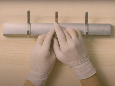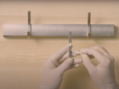 - Tineti seringa in pozitie verticala si apasati pistonul, astfel incat ambele componente ale adezivului vor iesi in proportii egale pe tava atasata.