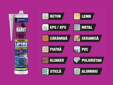 Mamut Fast este un adeziv modern cu prindere rapida, potrivit pentru profile si baghete decorative placi, panouri si multe alte materiale, care poate transforma complet modul in care abordezi lucrarile de montaj.