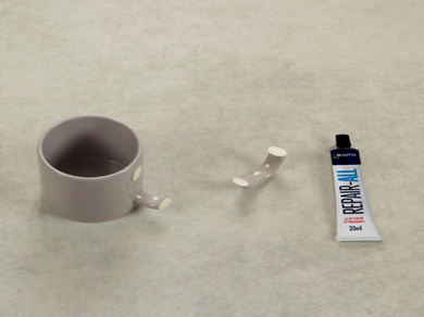 拿出破損的杯子和杯柄,確保所有需要黏合的表面都乾淨,沒有灰塵或油脂。